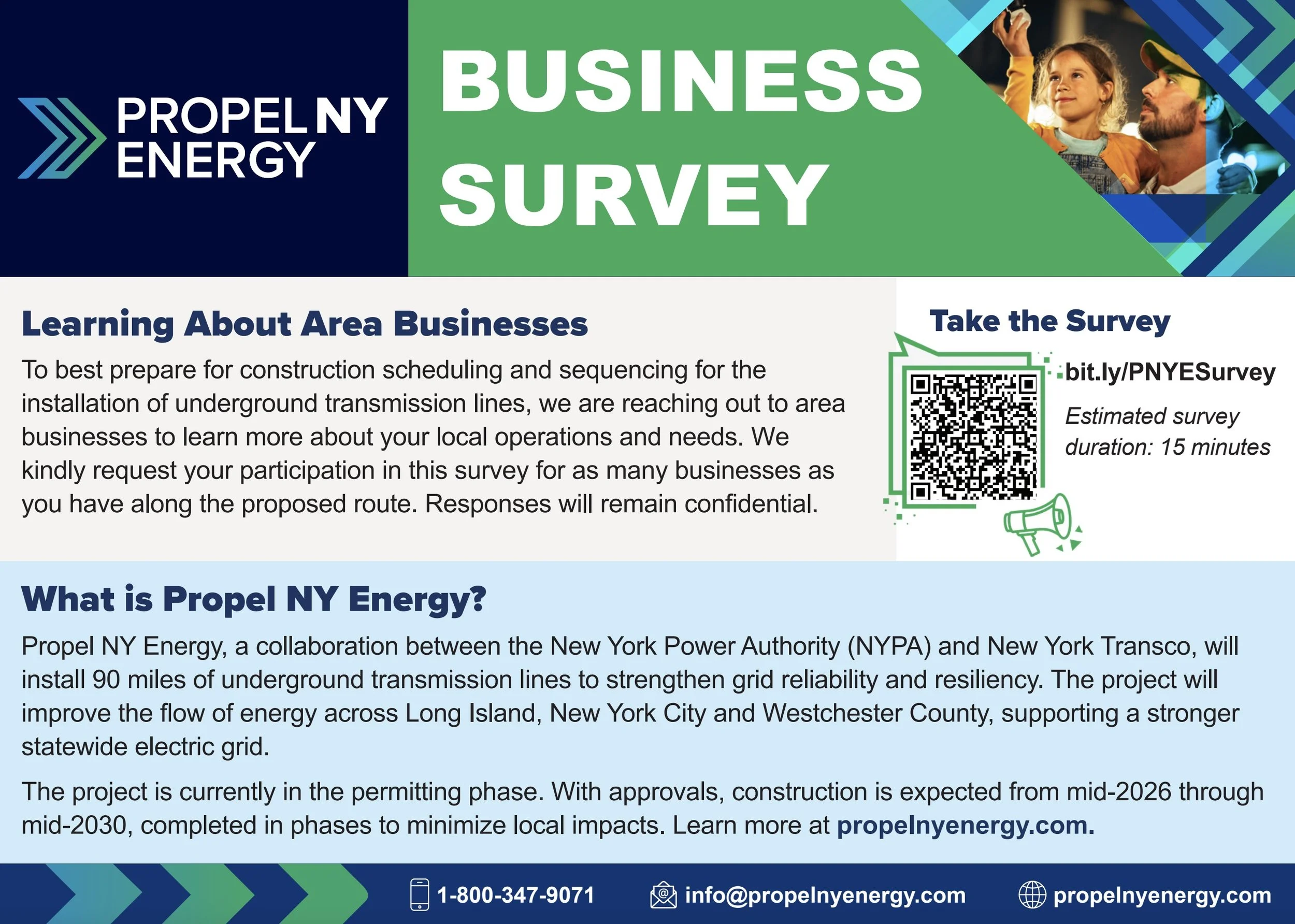 The Propel NY Energy Business Survey will help us better understand your business operations—such as hours, parking, and seasonal needs—so our team can plan local construction and scheduling as effectively as possible.