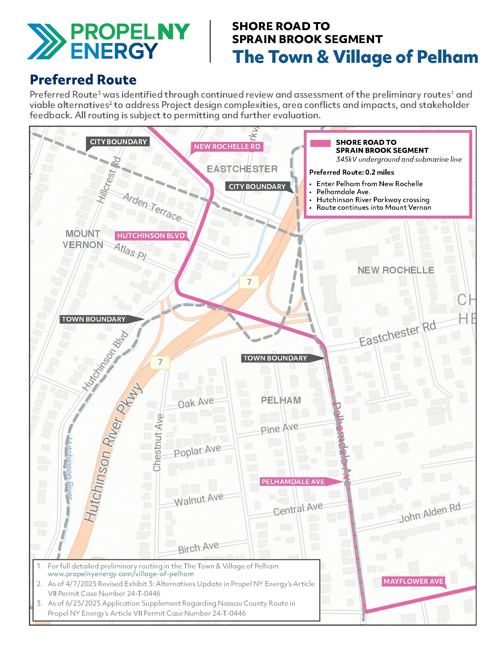 A project route was originally proposed in the July 2024 Article VII permitting application. In April 2025, viable alternative routes were identified in response to extensive input from local stakeholders — including municipalities, community organizations, and civic groups — and represent potential pathways to achieve the project’s objectives. These routes were further evaluated for inclusion in the Project’s permitted route. On July 23, 2025, a Preferred Project Route in Pelham was filed to the Article VII application with the New York State Public Service Commission for continued permitting evaluation.